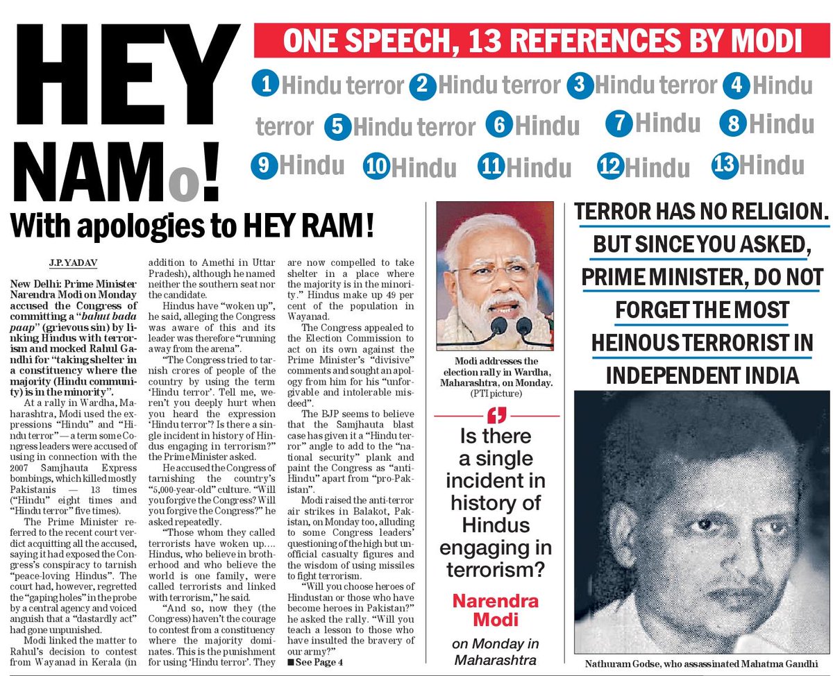 India: ‘The Telegraph’ reminds Narendra Modi of Nathuram Godse after PM asks: “Is there a single incident in history of Hindus engaging in terrorism?”