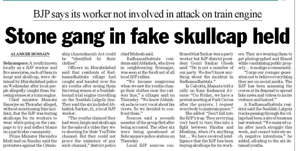 Source: The Telegraph, 20 Dec 2019 [see also: https://www.telegraphindia.com/states/west-bengal/stone-gang-in-fake-skullcap-held-by-murshidabad-police/cid/1728657}