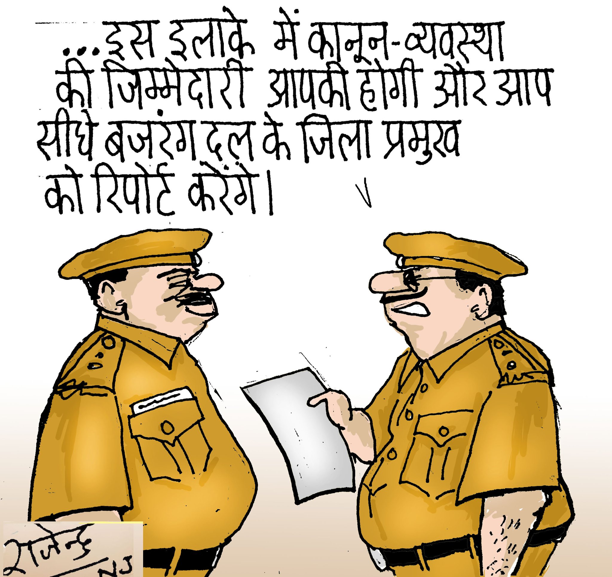 Caricature by Rajendra -- life in times of Hindutva "You are incharge of Law and order and you will report directly to Bajrang Dal (a group of the far-right)"