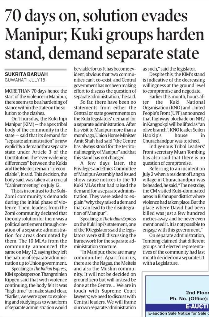 India: Manipur continued crisis means... Hardening stance of Kuki groups who want a separate state (Report in Indian Express)